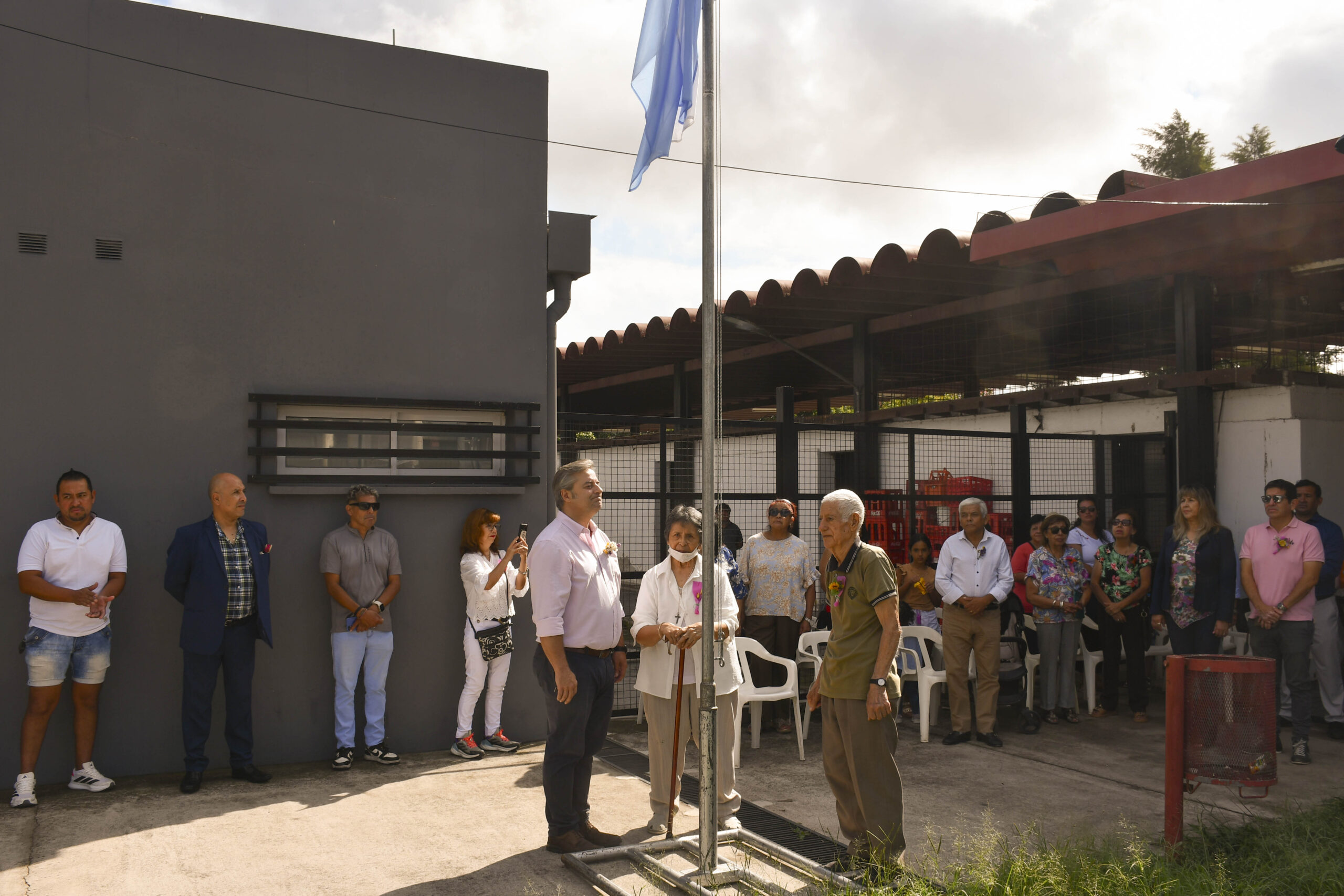 El acto inició con el izamiento de la Bandera Nacional a cargo del presidente del deliberante capitalino, Dr. Gastón Millón; junto a Ezequiel Reinoso, presidente del Centro Vecinal del Bº Santa Rosa; además de Berta Farfán y Julio Taglioli, vecinos que fueron parte de la comisión pro-templo.