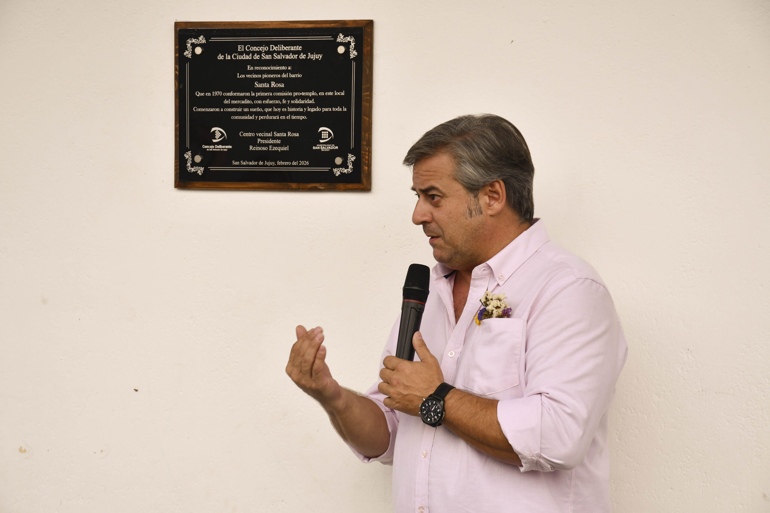 Estuvieron presentes, junto al presidente del Concejo Deliberante, Dr. Gastón Millón; la concejala Blanca Ontiveros; el coordinador del Concejo Deliberante, Alejandro Soruco; Ezequiel Reinoso, presidente del Centro Vecinal Santa Rosa; Isabel Parada, secretaria del Centro Vecinal Santa Rosa, entre otras autoridades, familiares de la primera comisión pro-templo, vecinos y público en general.