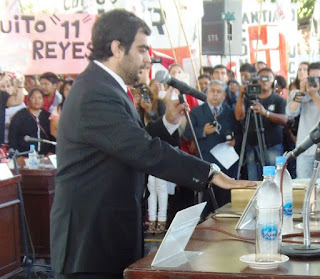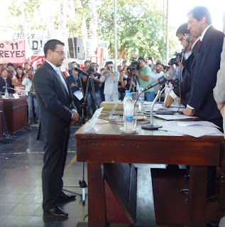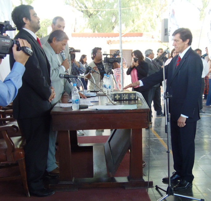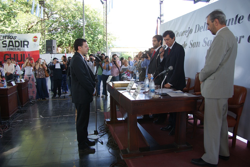 Luego de un pequeño cuarto intermedio y que la comisión mencionada se expedida a favor de la asunción de los ediles electos, se pasó a tomar el respectivo juramento, a cargo del Presidente de la institución, Carlos Sadir.