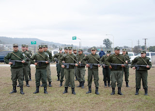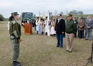 La ceremonia dio inicio cuando un efectivo allí apostado, procedió a guiar los saludos protocolares y a solicitarle al intendente Jorge y al Jefe de la Agrupación IX, el permiso correspondiente para iniciar el acto de izamiento de Banderas.